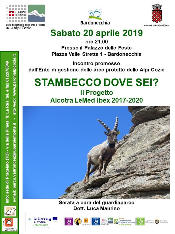 Sabato 20 aprile alle ore 21 a Bardonecchia, al Palazzo delle Feste di Piazza Valle Stretta, nell'ambito della XIIa edizione della Rassegna Chantar l'uvern, si darà una risposta al quesito “Stambecco dove sei?”, serata naturalistica a cura del guardiaparco Luca Maurino, responsabile scientifico per il progetto Interreg Alcotra, Fondo europeo di cooperazione transfrontaliera tra Francia e Italia, Ledmed Ibex, che si prefigge di migliorare la conservazione dello stambecco alpino sulla dorsale alpina tra Italia e Francia, dal lago di Ginevra (Léman) al Mediterraneo.