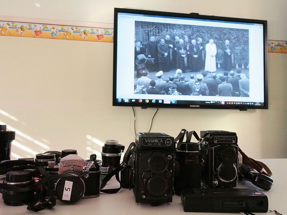 Ha parlato di un mondo in cui l’immagine non si poteva vedere immediatamente, ma richiedeva almeno qualche ora di lavoro per essere “sviluppata”, un tempo che spesso si trascorreva con trepidazione. Per l’occasione ha portato tutta l’attrezzatura necessaria: le fotocamere a pellicola, ovviamente, ma anche i rullini nei vari formati dal microfilm, al 35mm, al medio formato, una infinita serie di obiettivi, i serbatoi per lo sviluppo chimico delle pellicole, l’ingranditore e infine, una vera chicca: la macchina fotografica degli astronauti.