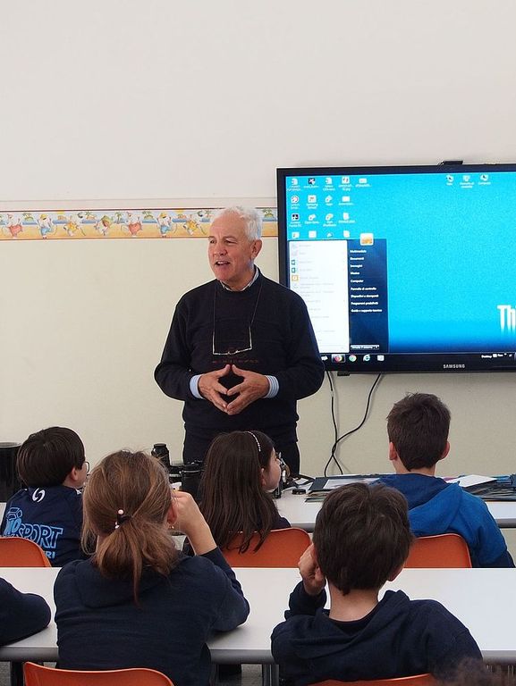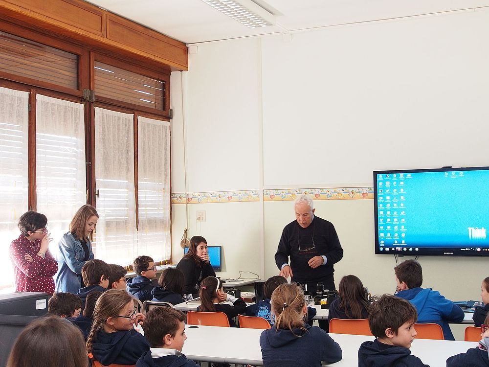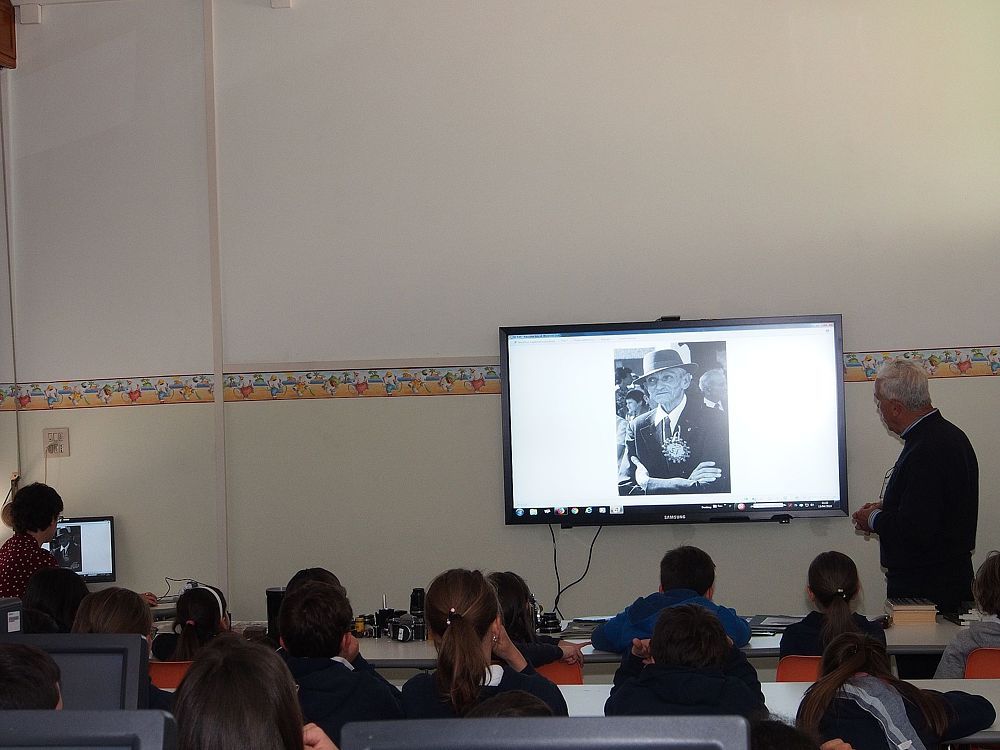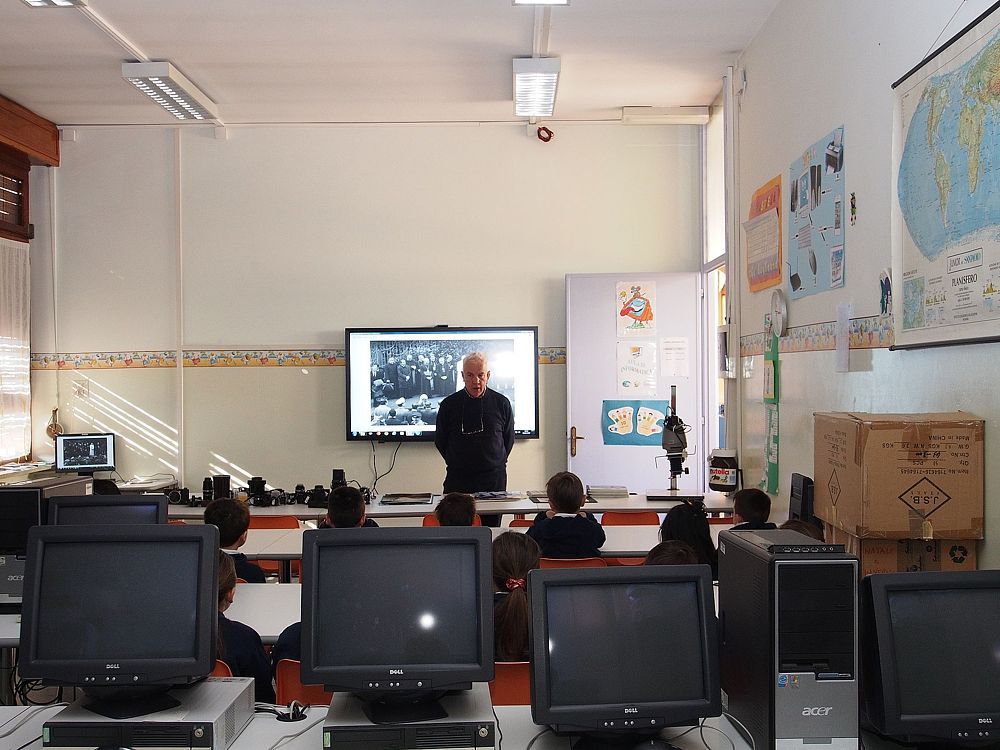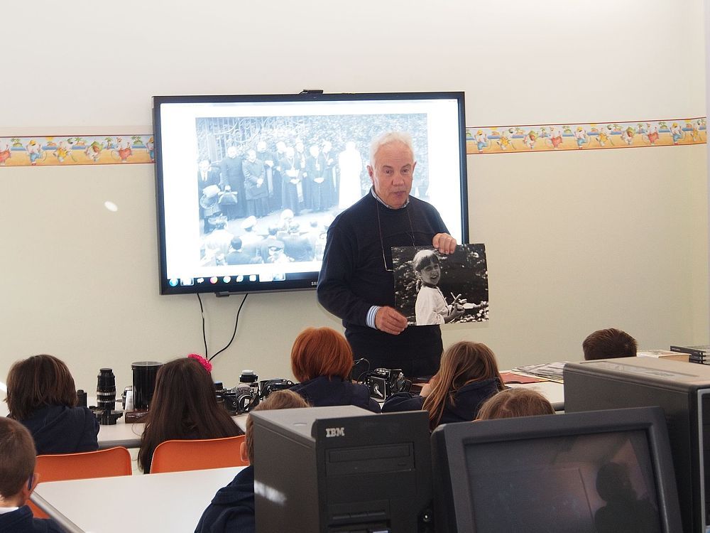 L’incontro si è svolto nell’aula di informatica della scuola, dove la lavagna multimediale, per un giorno si è trasformata in uno “specchio magico”, che ha riportato i bambini indietro nel passato, in un tempo in cui erano giovani i loro nonni, in cui le immagini erano in bianco e nero e dove molte delle strade di oggi erano prati. Si è realizzata una miscela di nuovo e tradizione, di gioventù e esperienza, con uno schermo elettronico che ha proiettato immagini in bianco e nero e con tanti bambini fermi ad ascoltare il racconto di un nonno.