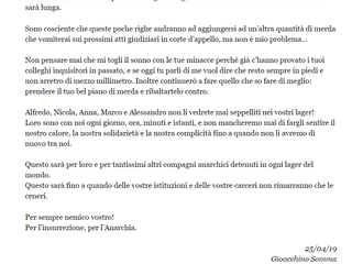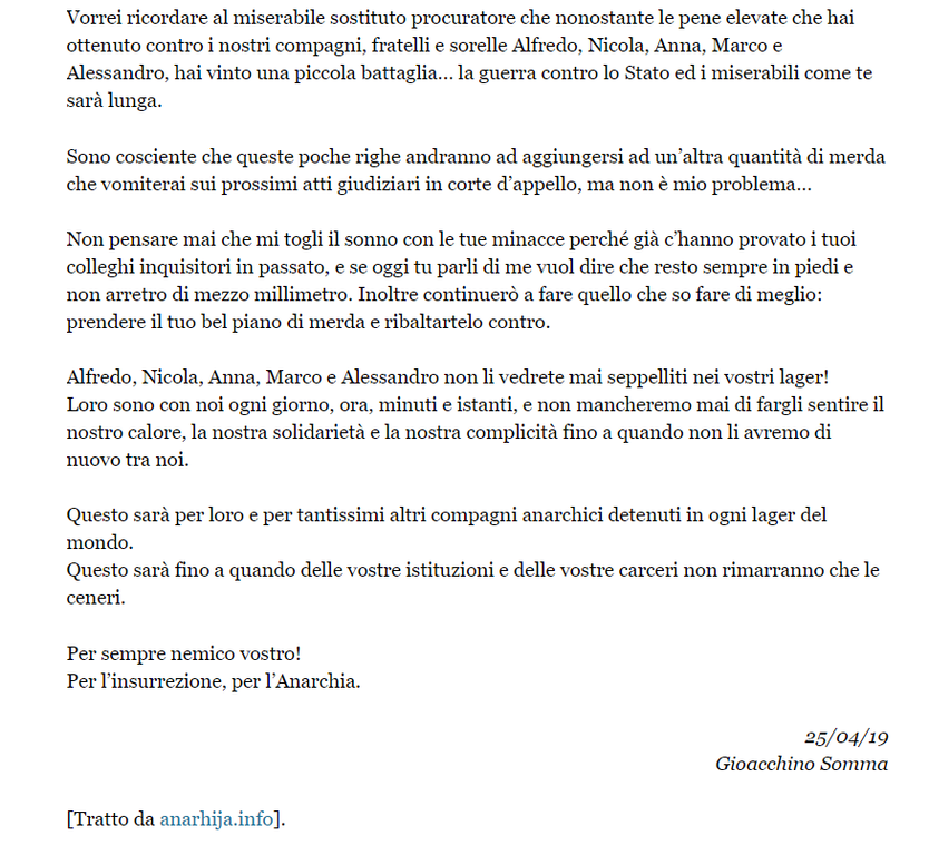 Il procedimento si è concluso con 5 condanne e 18 assoluzioni. Sul web è stato diffuso un testo che accusa Sparagna: "Hai vinto una piccola battaglia. La Guerra contro lo Stato sarà lunga"