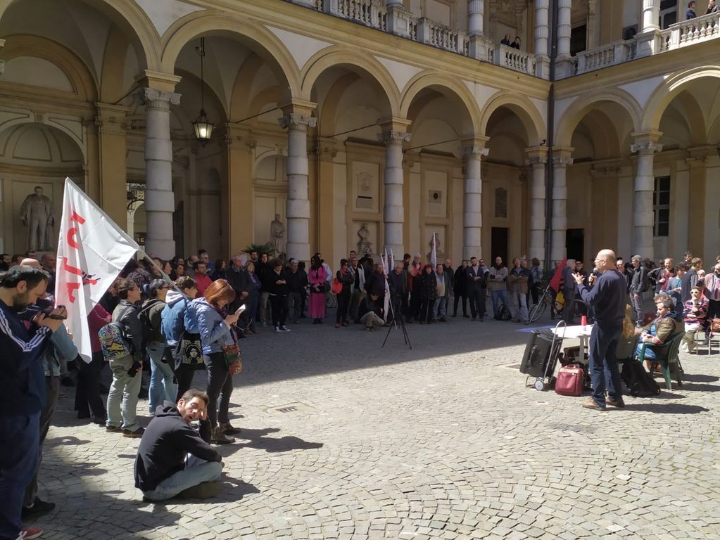 Pittavino ha ricevuto la solidarietà di studenti e docenti, tra cui l'associato di diritto costituzionale Alessandra Algostino e l'ordinario di diritto privato Ugo Mattei, che dal cortile di Via Po 15 hanno attaccato l'Università per l'applicazione in chiave repressiva del CCNL: “Questa – ha spiegato la prima – è una norma che non rispetta principi fondamentali della Costituzione come quelli di ragionevolezza e di non colpevolezza. L'Università, che dovrebbe essere luogo di democrazia ed espressione del conflitto e del dissenso, preferisce reprimere le scelte politiche anziché difendere il lavoro di un proprio dipendente”. “Pier Paolo – ha aggiunto il secondo – ha subito un'ingiustizia gravissima, nel diritto l'atto dovuto non esiste, bensì esiste l'interpretazione: stiamo assistendo alla sostituzione degli uomini con le macchine attraverso una norma sciagurata che, utilizzando i principi del diritto, esclude chi dissente”.