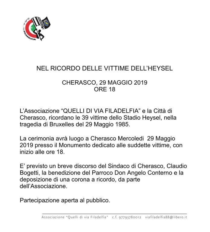 Famigliari, Societá, Istituzioni, Tifosi si sono uniti attorno ai simulacri che rappresentano il ricordo della Tragedia. Da Reggio Emilia a Meda, per passare dal Veneto a Cherasco e quindi nell’epicentro celebrativo a Torino, con la ‘Giornata della Memoria per le Vittime dell’Heysel e di ogni Manifestazione sportiva’.