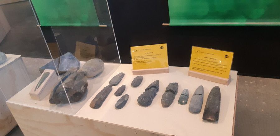 I visitatori incontrano nel percorso una capanna neolitica, scoprono l’agricoltura, la tessitura, gli attrezzi, la cura della persona, gli strumenti di cottura e di fabbricazione del tempo remoto. Nel secondo salone sono esposti reperti mineralogici, tecniche lavorative artigianali, manufatti e riproduzioni di grandi asce, simili a quelle che percorsero le vie commerciali n tutta Europa.