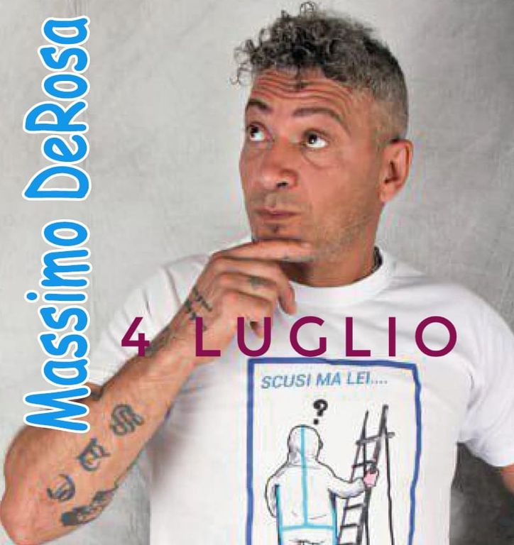Per il 4 luglio ci sarà lo spettacolo di MASSIMO DE ROSA che arriva dall’esperienza del Cab 41 e dal Laboratorio Zelig di Torino come comico prorompente che propone personaggi eccentrici e monologhi attuali pieni di sarcasmo.