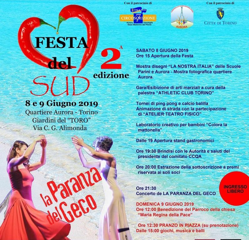 Il Comitato Cittadini Quadrilatero Aurora si impegna quotidianamente per combattere il degrado e l’insicurezza sensibilizzando le istituzioni e promuovendo azioni per la riqualificazione del territorio. Fa parte di questo percorso la seconda edizione della FESTA DEL SUD, in programma sabato 8 e domenica 9 giugno presso i giardini Alimonda.