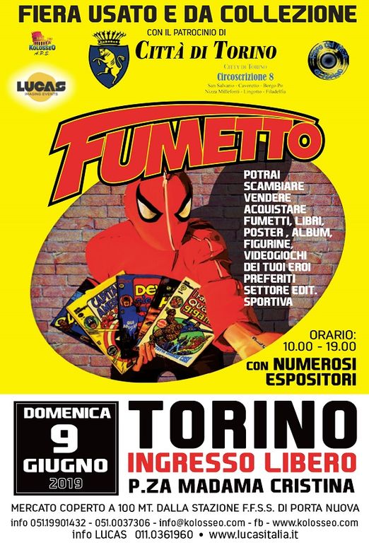 L’appuntamento per i collezionisti e gli appassionati di fumetti, ad ingresso libero, è per domenica 9 giugno, come sempre presso il Mercato Coperto di Piazza Madama Cristina, con orario continuato dalle ore 10:00 alle 19:00.