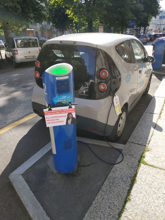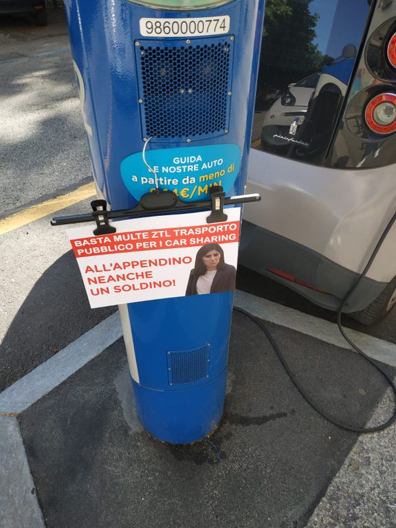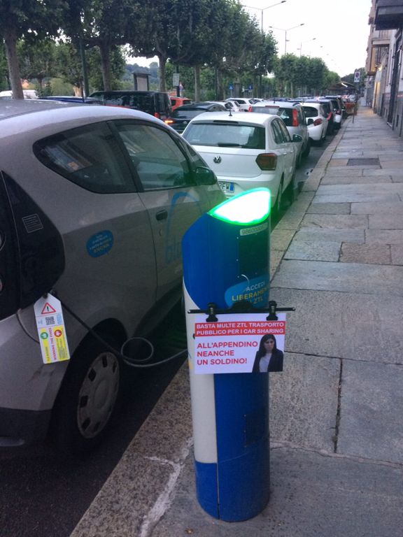 Si tratta di un cartello, riportante proprio la figura della prima cittadina e agganciato alle paline di ricarica elettrica attraverso un appendiabiti (un appendino, appunto). La frase? "Basta multe ZTL trasporto pubblico per i car sharing. All'Appendino neanche un soldino".