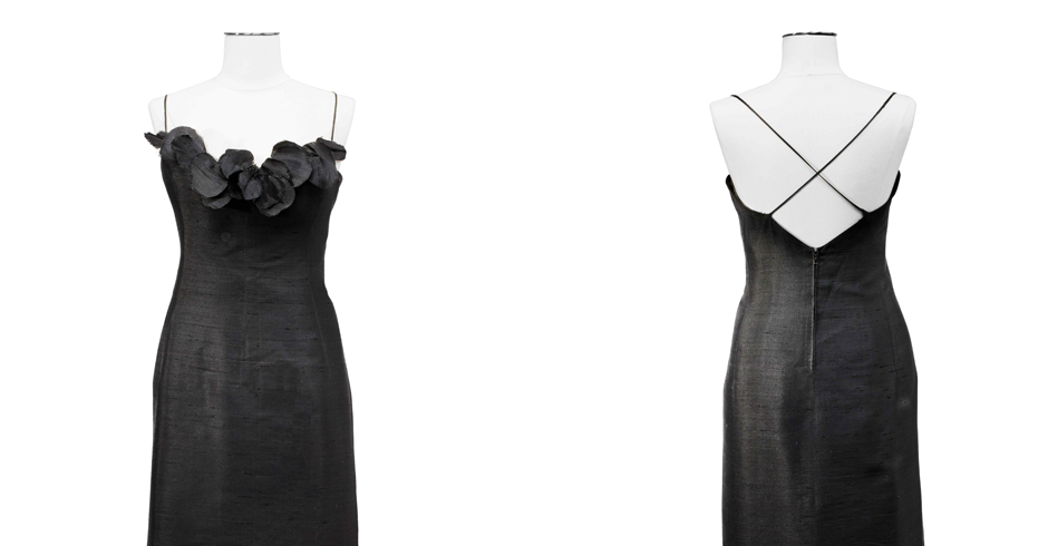 Capolavoro della commedia all’italiana, il film – tra i primi ad affrontare il tema della corruzione nella gestione degli appalti pubblici – si arricchisce della presenza di due grandi protagonisti: Ugo Tognazzi e una splendente Claudia Cardinale, che nella celebre scena finale del Magnifico cornuto sfoggia questo abito da cocktail di shantung nero, poi indossato dall’attrice anche in vari eventi fuori dal set.