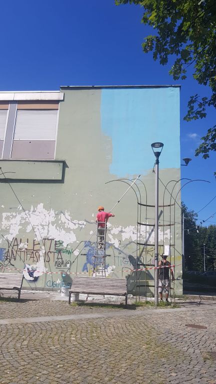 E’ qui, sulla facciata del palazzo Atc che divide la piazza del mercato, che residenti, volontari di Torino Spazio Pubblico e professionisti stanno realizzando un murales per omaggiare la memoria dei due ragazzi. L’abbattimento delle passerelle infatti aveva portato alla rimozione degli striscioni e per diversi mesi nel quartiere non si era trovato modo di celebrarne il ricordo. In questi giorni però l’intonaco cadente del palazzo sta lasciando spazio a una facciata “tirata a lucido”, ripristinata e dipinta.