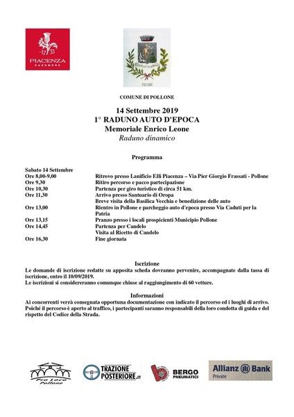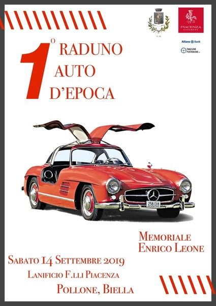 Il 1° Raduno Auto d'Epoca, Memoriale Enrico Leone, si terrà sabato 14 settembre, con ritrovo dalle 8 alle 9 presso il Lanificio Fratelli Piacenza di Pollone. Alle 09:30 ritiro di percorso e pacco di partecipazione, alle 10 partenza per il giro turistico di circa 51 km, alle 11:30 arrivo al Santuario di Oropa, dove ci sarà una breve visita alla Basilica Vecchia e la benedizione delle auto. Alle 13 rientro a Pollone dove le auto saranno parcheggiate in Via Caduti per la Patria. Alle 13:15 pranzo nei locali posti di fronte al municipio di Pollone. Alle 14:45 partenza per Candelo, dove ci sarà una visita al Ricetto. La giornata si chiuderà alle 16:30.