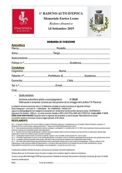Le domande di iscrizione al raduno devono essere presentate entro il 10 settembre alla Pro Loco di Pollone; oppure a Paolo Delsignore (cell. 3400811370; mail pdelsign@gmail.com); oppure al 335252093 (attuale numero del Garage Trazione Posteriore, e vecchio numero di Enrico Leone che la moglie ha voluto mantenere). Le iscrizioni si considereranno chiuse al raggiungimento di 60 vetture.