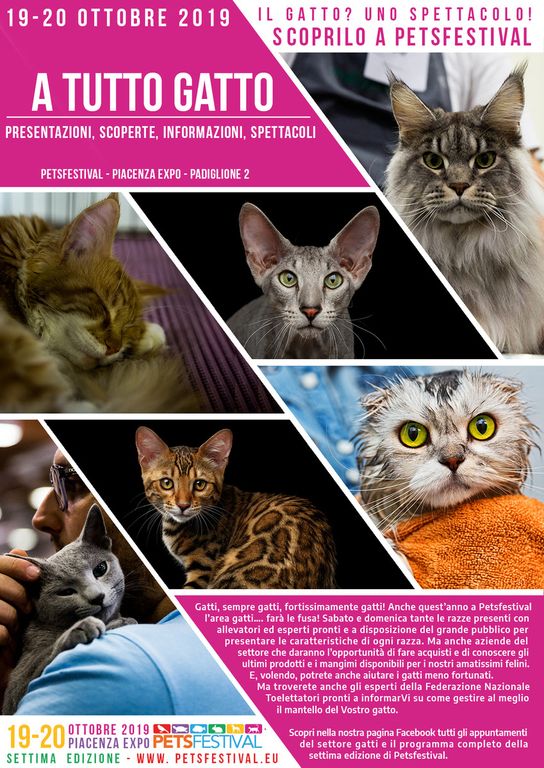 Sabato e domenica, 19 e 20 ottobre, tante le razze presenti con allevatori ed esperti pronti e a disposizione del grande pubblico per presentare le caratteristiche di ogni razza. Ma anche aziende del settore daranno l’opportunità di fare acquisti e di conoscere gli ultimi prodotti e i mangimi disponibili per i nostri amatissimi felini. E, volendo, potrete anche aiutare i gatti meno fortunati. Infine troverete anche gli esperti della Federazione Nazionale Toelettatori pronti a informarVi su come gestire al meglio il mantello del Vostro gatto. Insomma uno spettacolo nello spettacolo. E che spettacolo! È l’area gatto di Petsfestival che Vi attende nel padiglione 2.