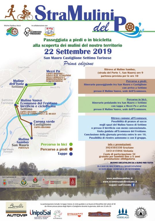 L’associazione Mulino Sambuy onlus, in collaborazione con Ri-ciclistica Settimese ed Ecomuseo del Freidano, organizza la prima edizione della Stramulini domenica 22 settembre 2019.