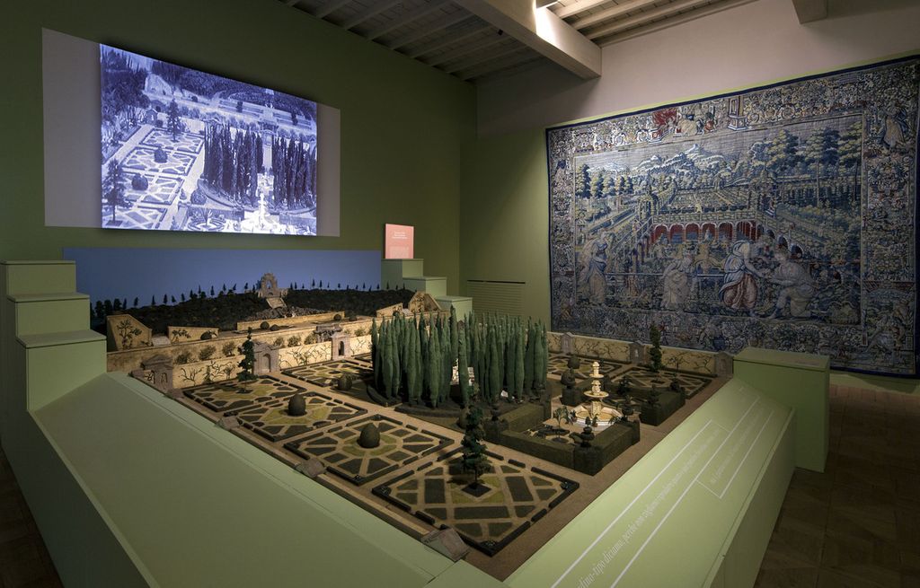L’esposizione si apre con il viaggio di Montaigne (“Il viaggiare mi sembra un esercizio giovevole. L’anima vi si esercita continuamente notando cose sconosciute e nuove”), che accompagna il visitatore nei più famosi giardini italiani del Cinquecento, tra grotte, automi e giochi d’acqua, visitando più di una volta le ville medicee in Toscana: tre volte Castello, due volte Pratolino mentre è in costruzione il Colosso dell’Appennino del Giambologna. Nel secolo successivo, il viaggio di André Le Nôtre offre l’occasione per illustrare la diffusione in Europa di un nuovo modo di concepire complessi su grande scala, quel “giardino alla francese” che diventa una formula per esprimere tutti il potere di grandi e piccoli Re Sole.