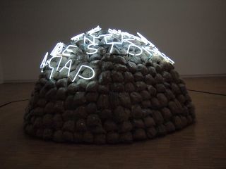 L’artista biellese raffigura un gruppo di manifestanti pacifisti, rappresentati con delle sagome fissate a uno specchio, in modo tale che gli osservatori vi si riflettano diventando parte integrante dell’opera stessa. L’installazione di Merz, invece, riporta sulla creta una frase del comandante, composta da tubi di neon luminosi: “Se il nemico si concentra, perde terreno, se si disperde, perde forza”. Una forma, quella della calotta, abitazione minimale degli eschimesi, scelta dall’artista a partire dal ‘67 come rimando a uno stadio primordiale della civiltà umana, a contatto diretto con la natura. Proprio come immerso in un’oasi naturale è il Viet Caffè, che quest’estate ha festeggiato il suo primo anno di attività.