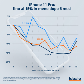Sebbene i prezzi di lancio dei nuovi dispositivi siano ancora avvolti dal mistero, noi di idealo abbiamo provato a realizzare una stima approssimativa dei possibili cali di prezzo dell'iPhone 11 Pro nei mesi successivi alla sua commercializzazione. Per ottenere dei dati attendibili circa il nuovo modello è stato analizzato l’andamento dei prezzi di iPhone XS nelle versioni da 64, 256 e 512 GB. Secondo le nostre proiezioni, il nuovo iPhone, nei tagli di memoria più piccoli come il 64 e 256 GB, subirà un calo di prezzo costante registrando nei primi tre mesi un abbassamento del costo di circa il 10% che diventerà del 13 e del 15% a sei mesi dal lancio.