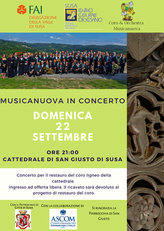 La Delegazione FAI della Valle di Susa organizza per domenica 22 settembre 2019 alle ore 21, nella cattedrale di San Giusto a Susa (To), il concerto del coro & orchestra “Musicanuova” di Vaie.