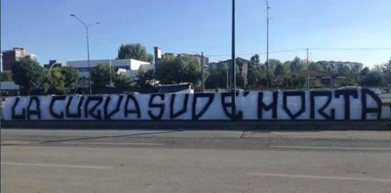 Uno striscione con la scritta "La curva sud è morta" è stato appeso nel pomeriggio in corso Grosseto, a Torino, poco lontano dall'Allianz Stadium.