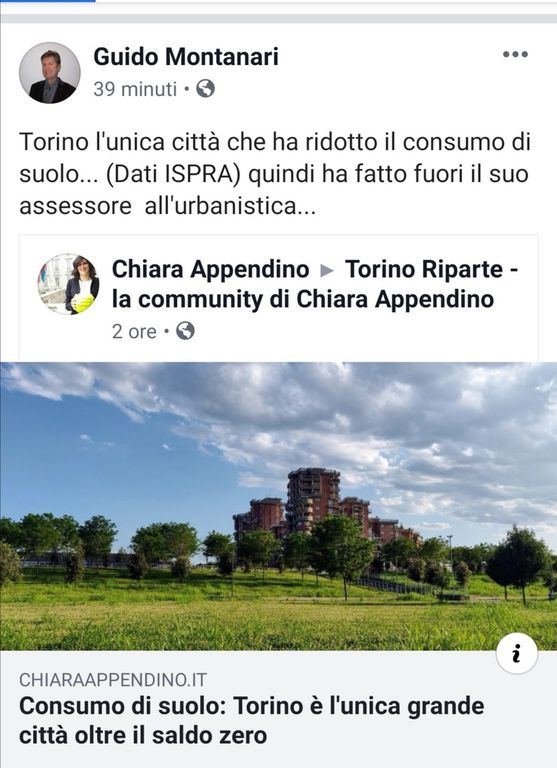 "Torino l'unica città che ha ridotto il consumo di suolo... (Dati ISPRA) quindi ha fatto fuori il suo assessore all'urbanistica...". A scrivere questa frase su Facebook è l'ex assessore comunale all'Urbanistica Guido Montanari, a commento della notizia condivisa dalla sindaca Chiara Appendino sulla riduzione del consumo di suolo a Torino.