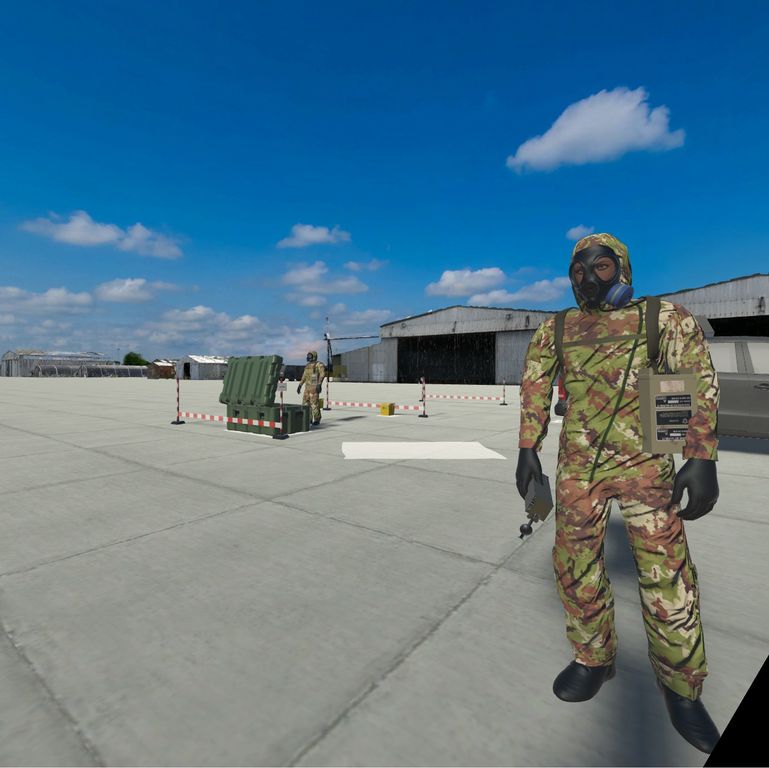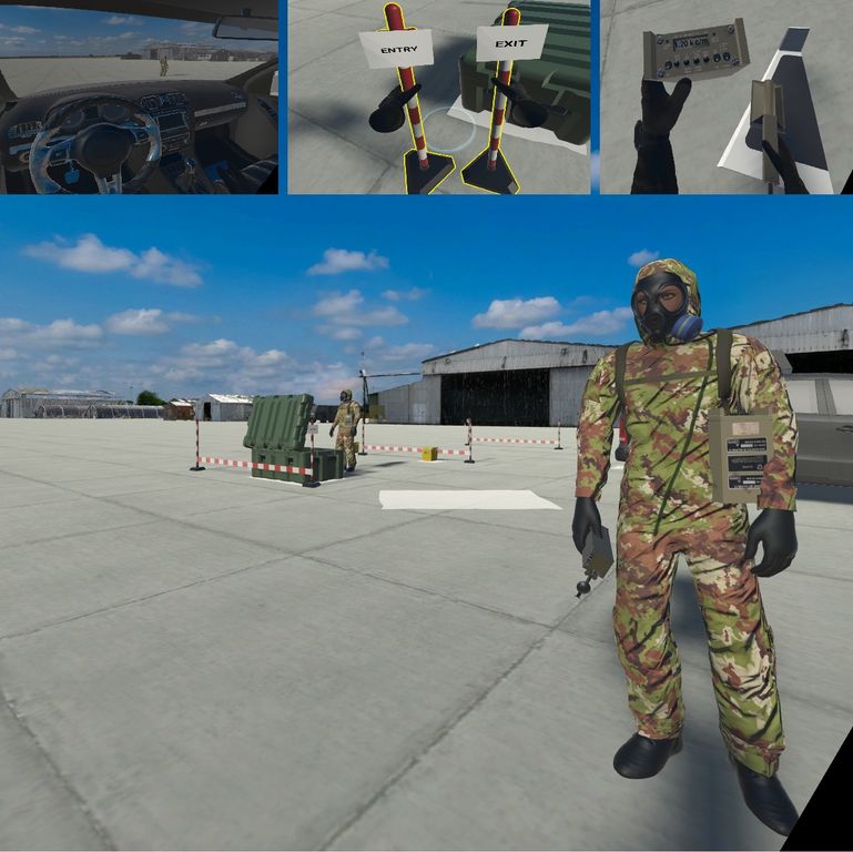 Nel mese di settembre 2019 il gruppo ha realizzato una prima simulazione interattiva immersiva in ambiente virtuale, focalizzata sulle procedure NATO che coinvolgono il rilevamento di agenti CBRN e la delimitazione dell’area contaminata (nome in codice, “RECCE TEAM”). La simulazione riproduce fedelmente in ambiente digitale la base dell’Aereonautica Militare di Villafranca di Verona, e consente agli operatori di effettuare un addestramento individuale o in team, interagendo da remoto in tempo reale con i propri colleghi e con l’ambiente.