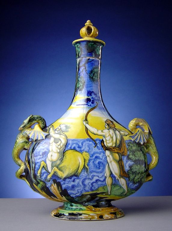 Fin dal primo Cinquecento, i maestri maiolicari iniziarono a sviluppare una sempre più attenta assimilazione dei temi pittorici, inserendo nelle loro opere immagini tratte da xilografie, che illustravano edizioni di celebri testi letterari come le Metamorfosi di Ovidio, le Storie romane di Tito Livio, il Vecchio e il Nuovo Testamento. Questi soggetti rappresentarono per tutto il 1500, grazie alla loro facile e tempestiva circolazione, il tramite per la divulgazione della cultura più aggiornata, prodotta per una committenza illustre, negli strati sociali più bassi.