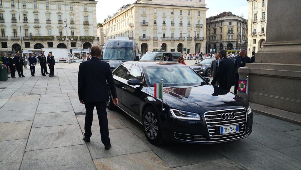 Tra i curiosi, assiepati su Piazza Castello, per la visita del Capo dello Stato anche alcuni tifosi del Bayer Leverkusen, che questa sera all'Allianz Stadium sfida la Juventus per la Champions League.