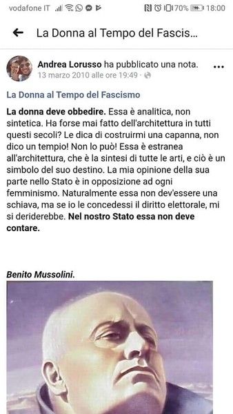 Il giovane è da ieri sotto attacco, e con lui l'assessora, per due post su Facebook pubblicati rispettivamente nel 2010 e nel 2014: nel primo, descrive la donna in epoca fascista, nel secondo pubblica una sua foto a Predappio, inginocchiato davanti al mausoleo di Mussolini, con il commento: "Io non ho tradito". Immediate le polemiche politiche, con il Pd che ha chiesto spiegazioni alla Caucino e il presidente Alberto Cirio che ha definito "inaccettabili" le posizioni di Lorusso.