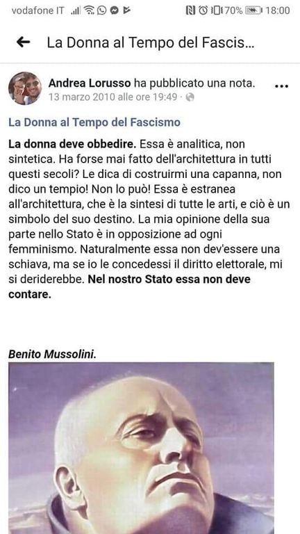 Lo scatto risale al 2014 (e al 2010 un altro post con scritto "La donna deve ubbidire" con riferimento alla pagina "La donna al tempo del fascismo"), ma la polemica si è infiammata ieri, quando a segnalarlo è stato un esponente del Pd locale, il consigliere della Circoscrizione 4 Gianvito Pontrandolfo.