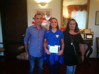 Aurora Ena, 15 anni, da un decennio pratica twirling ma è anche un'asparegetta. Nel 2019 si è aggiudicata il sesto posto europeo del freestyle juniores a luglio in Francia, il terzo italiano in serie A e il secondo posto sempre in Italia del duo junior con la compagna Stella Pallanza. Nel 2018 ha raggiunto il secondo posto all'Europa Cup Baton Twirling a Dublino e terzo posto nel 2017 in Croazia. "Prossimo obiettivo è il campionato mondiale 2020 in serie A - ha dichiarato Aurora - Poi in futuro vorrei proseguire come allenatrice. Mi alleno 4 volte a settimana, oltre nella palestra di Santena anche a Cantalupa e Orbassano, è praticamente un lavoro part time, 3/4 ore di allenamento ogni volta". Alla cerimonia anche mamma e papà Rossano Ena e Anna Izzo. "È una cerimonia semplice, ma che abbiamo organizzato in pochi casi con altri atleti del tuo valore - ha precisato Paolo Romano, Assessore allo sport del Comune di Santena - Va dato merito anche alla società nella quale ti alleni. Essere un atleta agonista significa per un adolescente rinunciare a tante cose. Significa avere interessi diversi dai propri coetanei, fare sacrifici, non avere tempo al di là della squadra. Poi tornare a casa e studiare fino a tardi. Quindi un plauso va non solo ai risultati, ma alla tenacia e alla costanza di questa giovane atleta santenese".