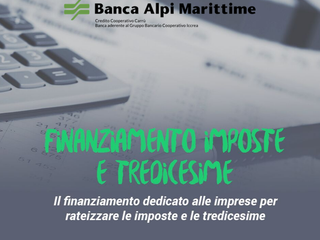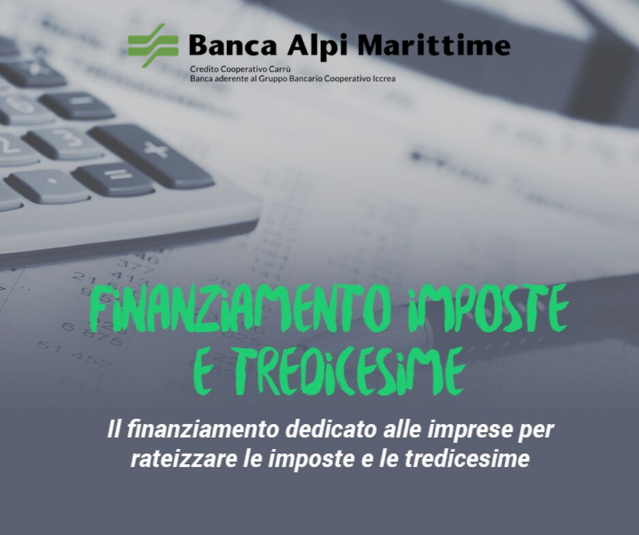 Banca Alpi Marittime mette a disposizione un nuovo finanziamento per imposte e tredicesime aiutando così le imprese a sostenere le scadenze fiscali, senza intacccare l’equilibrio economico dell’azienda nella chiusura di esercizio, anzi contribuendo a migliorare l’utilizzo dei fidi in conto corrente.
