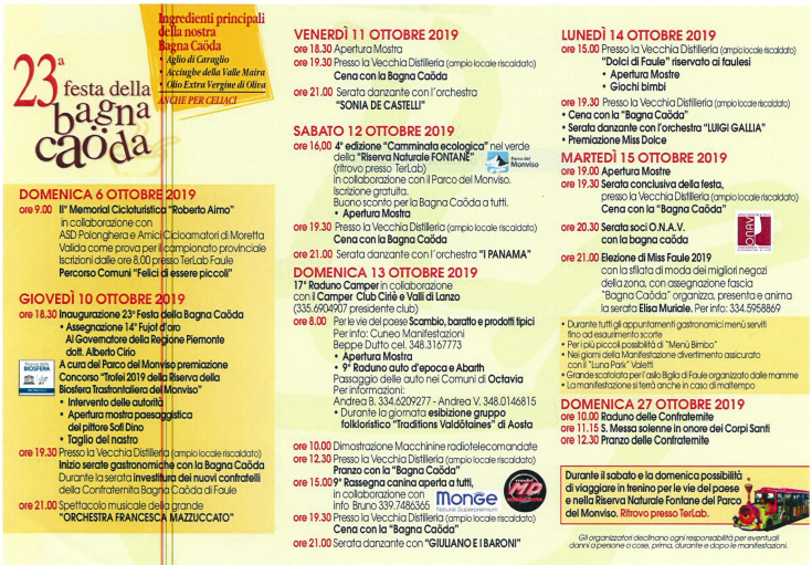 A Faule è tradizione ormai da 23 anni organizzare la Festa della Bagna Caöda nella seconda metà di Ottobre, e quest’anno verrà inaugurata giovedì 10 alle h 18,30 per poi proseguire, con un ricchissimo calendario di appuntamenti, fino a martedi 15 ottobre con la serata conclusiva e l’elezione di Miss Faule 2019.