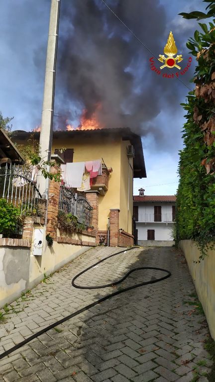 Intervento congiunto di squadre dei comandi di Torino e Vercelli a Verrua Savoia. Intorno a mezzogiorno un tetto di una casa di 2 piani è stato attaccato da un incendio.