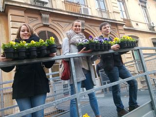 Divisi per gruppi gli studenti hanno messo a dimora viole del pensiero nelle fioriere poste sui davanzali dei lunghi corridoi Rosselli e Turati.