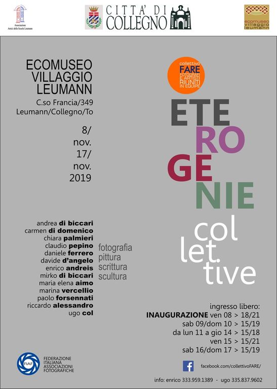 Dall’ 8 al 17 novembre 2019 il Collettivo FARE (Fotografi e Artisti Riuniti in Équipe) sotto il patrocinio del Comune di Collegno e della FIAF – Federazione Italiana Associazioni Fotografiche, esporrà nel Salone dell’Ecomuseo Leumann a Collegno, una panoramica della loro produzione artistica in cui verranno esposte fotografie, quadri, sculture, scritti.