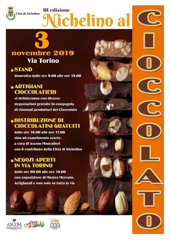 Organizzata in collaborazione con Ascom e Carosello Eventi, l'iniziativa si svolgerà in via Torino. Gli stand saranno aperti dalle ore 9 alle 19: artigiani cioccolatieri delizieranno i passanti con degustazioni gratuite in compagnia di rinomati produttori del cioccolato, mentre dalle 16 alle 17 verranno distribuiti cioccolatini gratuiti a cura di Ascom Moncalieri con il contributo della Città di Nichelino.