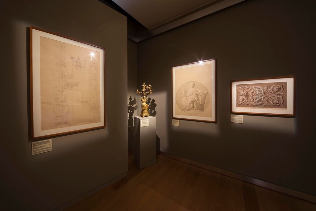 Cuore della mostra sono i trentuno fogli della Biblioteca dell’Archiginnasio di Bologna messi in dialogo, dove possibile, con le opere a cui si riferiscono. Il percorso espositivo inizia al secondo piano della Galleria Sabauda, precisamente dallo Spazio Scoperte. Accanto ai disegni progettuali relativi al Salone delle Guardie Svizzere e alle principali sale di rappresentanza, saranno anche allestite alcune opere effettivamente realizzate e tuttora conservate a Palazzo Reale. Nello specifico, il dipinto raffigurante San Michele Arcangelo (modello per una vetrata realizzata nel Castello di Pollenzo), il taboretto scolpito in legno dorato e il ricco candelabro figurato in bronzo dorato provenienti dalla Sala delle Udienze Private, a testimoniare l’attività dell’équipe palagiana. I diversi progetti, accostati uno all’altro, permettono di cogliere le caratteristiche stilistiche di Palagi, fra recuperi classici e rispetto delle preesistenze barocche. Ampio rilievo è dato alla progettazione della neoclassica Sala da Ballo, autentico capolavoro dell’artista, al disegno di un nuovo Scalone d’Onore (mai realizzato), agli ambienti e agli arredi dell’Armeria Reale.