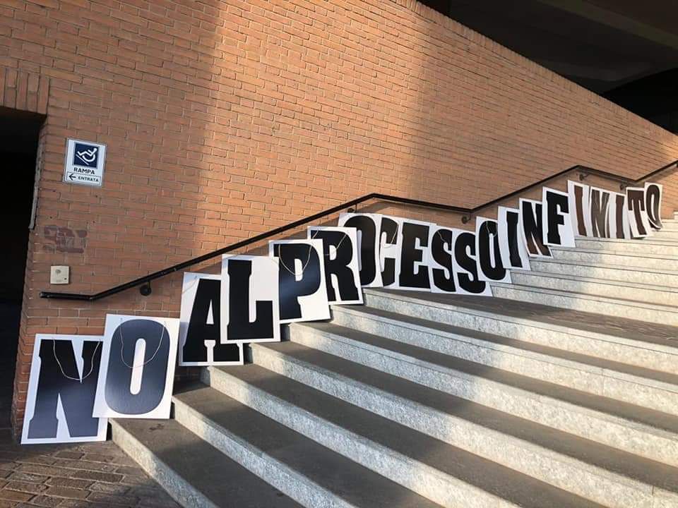 Al Palagiustizia hanno esposto numerosi cartelli per formare la frase "No al processo infinito"