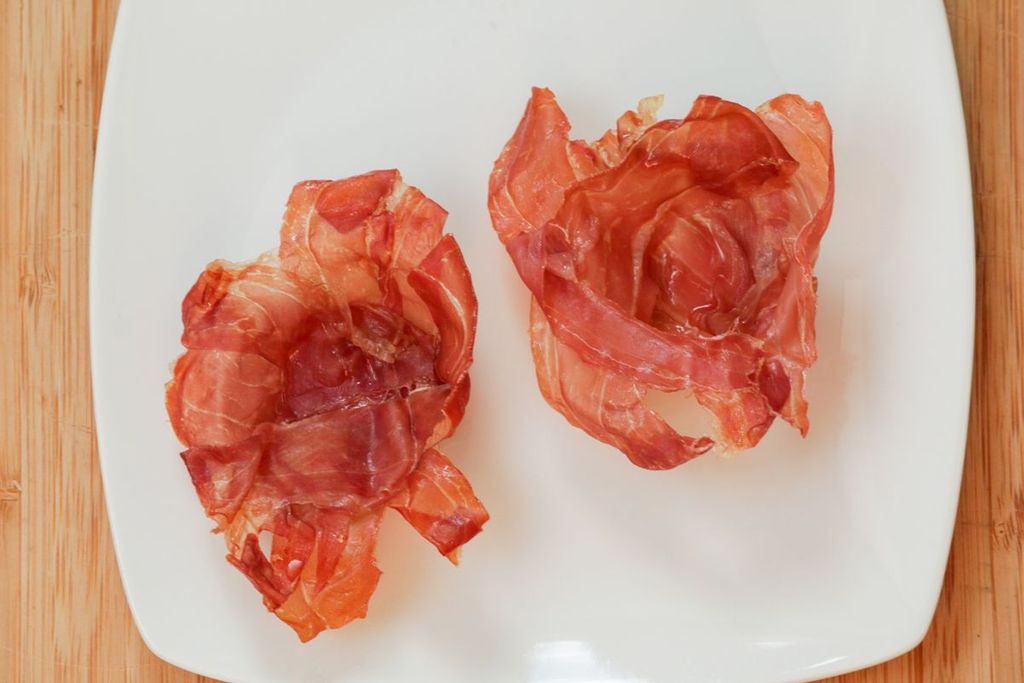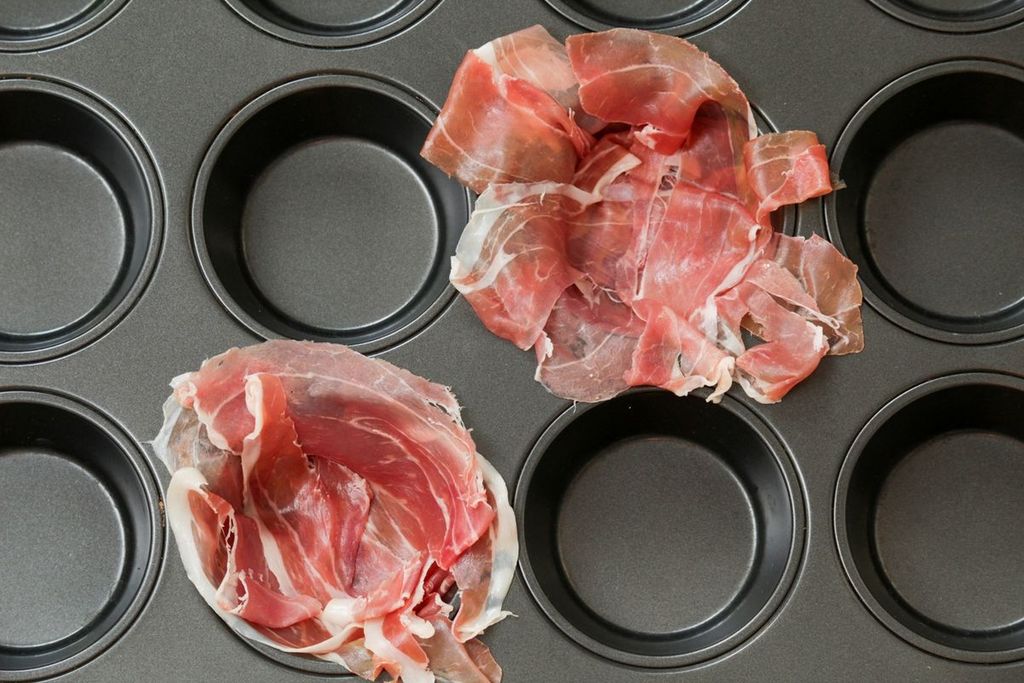 Foderate degli stampini da muffin con le fette di prosciutto crudo tagliato sottile e infornate a 200°C per 5 minuti.