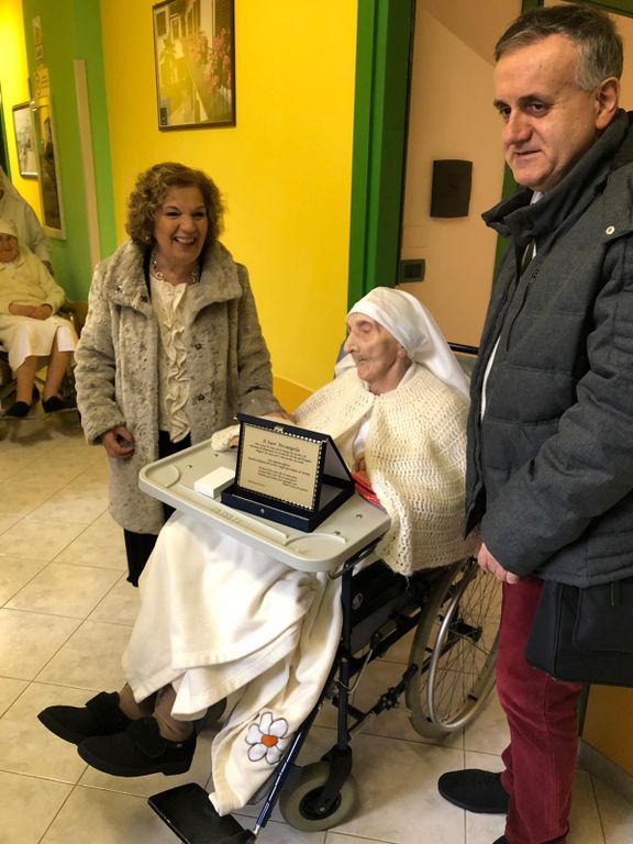 Una delegazione UICI Torino, guidata dal presidente Giovanni Laiolo e dalla vicepresidente Titti Panzarea, ha fatto visita all’Istituto Povere Figlie di San Gaetano, a Pancalieri (Torino), dove la religiosa abita, e le ha portato alcuni piccoli doni, tra cui una targa-ricordo, un mazzo di fiori e una torta. Oggetti semplici, che vogliono però testimoniare un affetto profondo. Da notare che tra pochi mesi, come suor Arcangela, anche l’Unione Ciechi festeggerà un secolo di vita, ragione in più per sottolineare un legame particolare e dare risalto al compleanno.