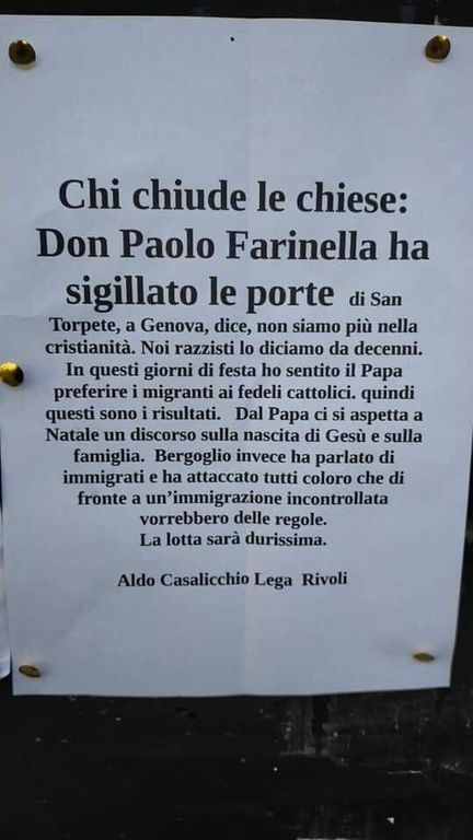 Ha rivendicato di essere "razzista" e poi ha attaccato il Papa reo di essere troppo pro-migranti e ostile ai cattolici. Un consigliere locale della Lega, Aldo Casalicchio, ha tappezzato Rivoli di volantini per spiegare la sua teoria. Ma la segretaria rivolese del partito, Laura Adduce, ha subito preso le distanze da questa iniziativa.