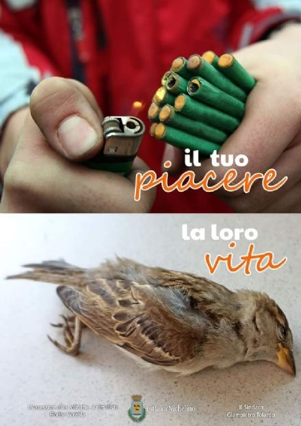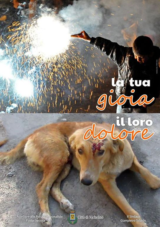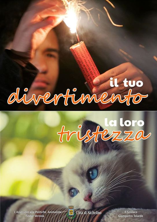 A Nichelino l'Amministrazione ha lanciato la campagna ''Il tuo piacere, la loro vita'', con un'immagine che rende perfettamente l'idea di quanto può accadere a causa dell'uso senza regole di fuochi d'artificio e affini per festeggiare l'arrivo del nuovo anno. "Vogliamo fare comprendere che la stessa dinamica può suscitare emozioni ben diverse tra mondo animale e mondo umano", ha detto l'assessore alle Politiche animaliste di Nichelino Fiodor Verzola. "Purtroppo si vuole che i festeggiamenti del nuovo anno vengano scanditi attraverso l’esplosione dei botti e fuochi d’artificio. A Nichelino sono vietati tramite un'ordinanza, ma purtroppo molti li fanno esplodere lo stesso".