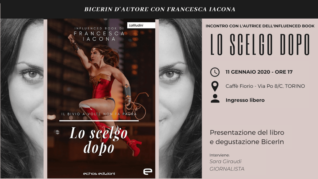 Sabato 11 gennaio, alle ore 17, presso il Caffè Fiorio di via Po, 8/C di Torino, si terrà “Bicerin d’autore”, evento culturale con Francesca Iacona, che presenterà il suo romanzo d’esordio “Lo scelgo dopo”, pubblicato da Echos Edizioni.