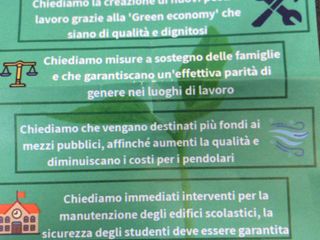 Tra un volantino e l’altro distribuito ai passanti, i Verdi hanno esposto gli altri punti del programma: la creazione di nuovi posti di lavoro grazie alla “green economy” e misure a sostegno delle famiglie che garantiscono parità di genere nei luoghi di lavoro.