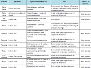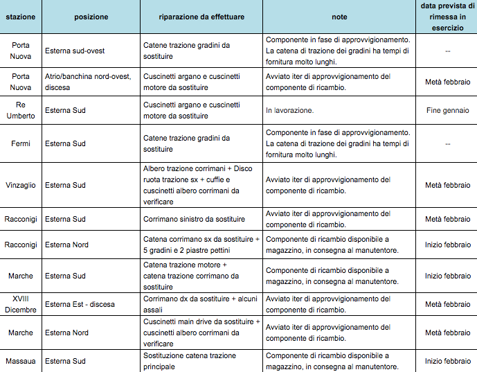 Il motivo di questa diversità? Le tempistiche di risoluzione del problema sono condizionate dall’arrivo dei pezzi di ricambio e dalla disponibilità del personale manutentivo. Per esempio, a Porta nuova i guasti riguardano la scala mobile esterna Sud-Ovest e quella che collega l'atrio alla banchina Nord-Ovest: in un caso la riparazione da effettuare riguarda le catene trazione gradini da sostituire, nell'altro i cuscinetti argano e cuscinetti motore da cambiare. Per il primo guasto le tempistiche sono piuttosto lunghe a causa dei tempi di fornitura, mentre per il secondo l'iter di approvvigionamento del componente è già stato avviato e terminerà a metà febbraio.