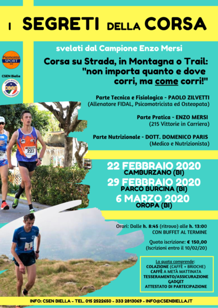 Andature ed esercizi propriocettivi, di equilibrio, core stability, coordinativi e di agilità sono alla base di un buono e duraturo rendimento; per questo, l’associazione Piemonte Sport A.S.D. (affiliata a CSEN Biella), ha organizzato “I Segreti della Corsa”, un corso ideato appositamente per chi desidera entrare nel grande mondo della corsa a piedi.Con le andature si imparerà a capire il movimento della corsa, sviluppandolo coordinando braccia e gambe; con gli esercizi propriocettivi si rinforzeranno caviglie ed equilibrio in situazioni di instabilità; infine, con la core stability, si potenzierà la parte bassa dell'addome, coinvolgendo anche la parte lombare della schiena, per avere stabilità durante la falcata.