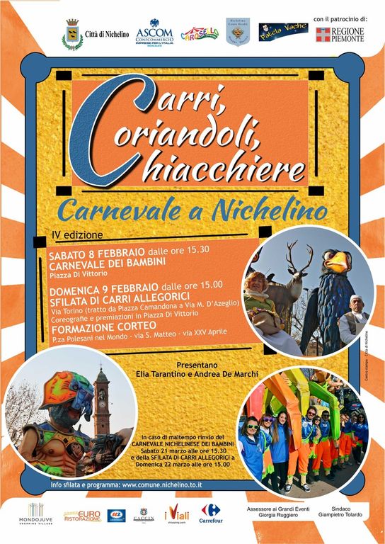 La sfilata, che vedrà impegnati ben 16 carri, si terrà domenica 9 febbraio. Il giorno prima, sabato 8, presentato da Andrea De Marchi, ci sarà il carnevale dei bimbi in piazza Di Vittorio a partire dalle 15.30, con distribuzione gratuita di chiacchiere, tè caldo e caramelle. Poi la premiazione dei migliori costumi dei bimbi, e la presentazione del carro nichelinese “La Favola dei giocattoli” realizzato dall'associazione “Patela Vache”. Il momento clou sarà però la sfilata domenicale con partenza alle 15 da piazza Camandona e arrivo in piazza Di Vittorio, dove ci saranno i balli coreografici degli oltre tremila figuranti dei carri.