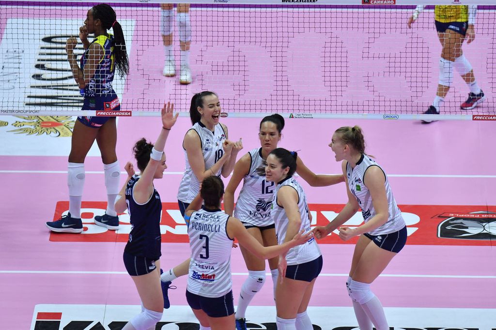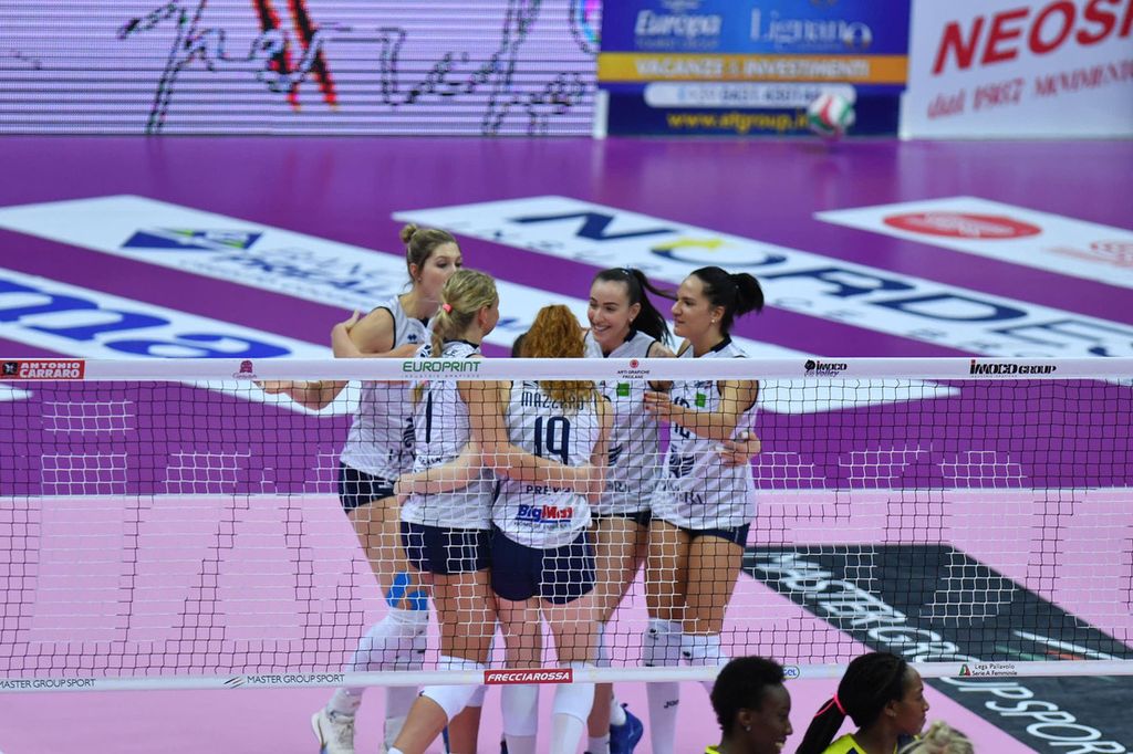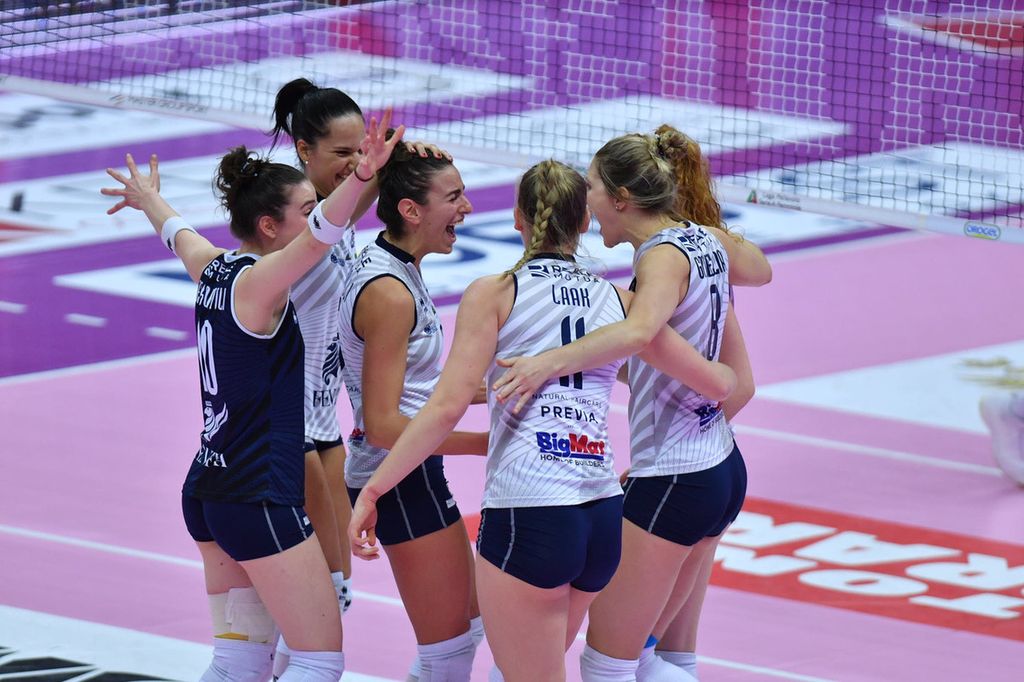La squadra di coach Bregoli ha disputato una partita di luci e ombre, che lascia in eredità sensazioni positive e qualche rammarico per non aver saputo giocarsela al meglio delle sue possibilità per tutta la gara. Il set meglio giocato è il primo, contraddistinto da diversi errori su entrambi i fronti ma anche da scambi lunghi e spettacolari, nel quale le biancoblù con un buon lavoro nel muro-difesa sono rimaste a contatto fino al 22-20 prima di cedere 25-21. Senza storia invece le due successive frazioni, relativamente equilibrate nelle fasi iniziali quindi a senso unico, la seconda conclusa 25-12 sotto i colpi di una Egonu devastante (8 punti col 100% in attacco), la terza 25-14 con strappo decisivo sul 13-11 a suon di muri di De Kruijf.