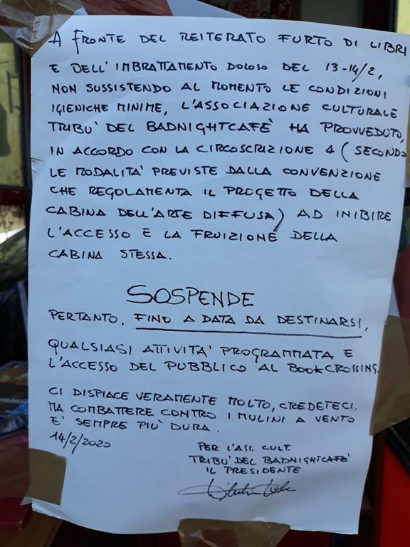 Ancora vandalizzata l'ex cabina telefonica di Piazza Peyron trasformata in galleria d'arte dall'associazione Tribù del Badnightcafè. Il presidente D'Antonio: “Sospendo l'attività”