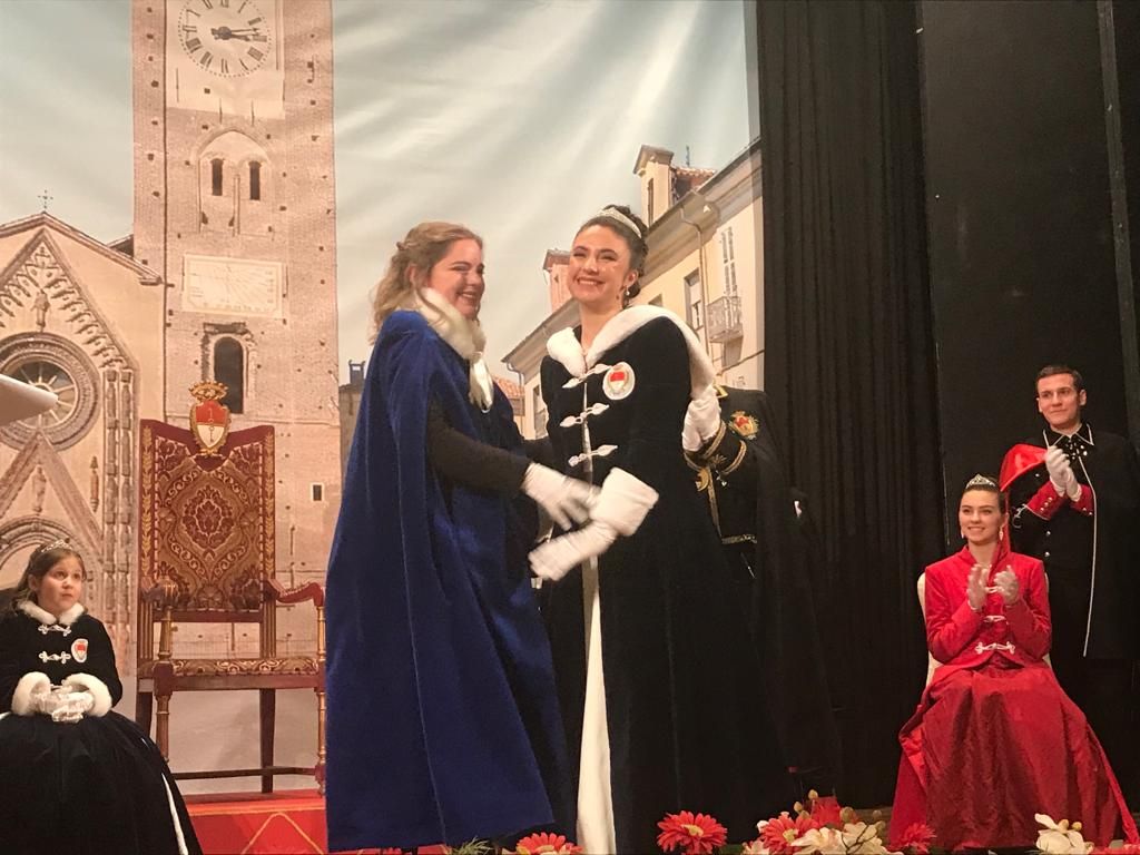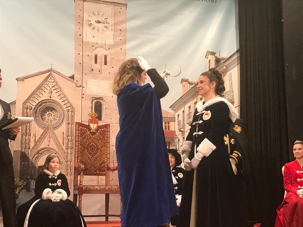 In una sala piena piena di cittadini e maschere provenienti dai paesi limitrofi accolti da Emanuel Bava, che ha vestito i panni di Abbà qualche anno fa, la Bela Tolera dello scorso anno, Giovanna Bonfante ha passato la corona a Melissa, emozionatissima e sorridente.