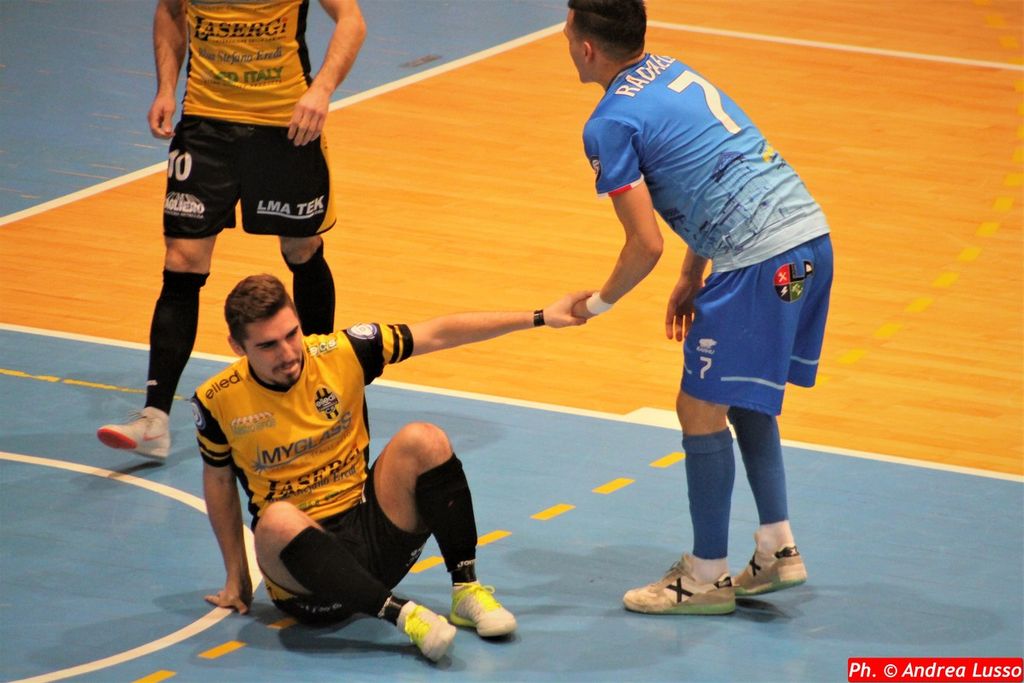Richichi scheggia il palo ad inizio secondo tempo, ma è l’ex Piazza a mettere i brividi alla porta fossanese: in due occasioni la palla finisce fuori di poco, alla terza Cafagna ci mette una pezza. Al quinto, spunto di Lahaye e Piazza insacca il 3-2! Cafagna su Di Gregorio e Ganci su una bella sortita offensiva di Cafagna, poi arriva il “doppio colpo” della Rhibo al decimo minuto: El Adlani e Radaelli portano il punteggio sul 5-2. Karaja prima e Di Gregorio poi giocano come portiere di movimento, per l’Elledì; Mantino timbra il palo, poi al 17′ viene concesso un rigore ai gialloneri (per fallo di mano di Gerlotto, poi ammonito) ma dal dischetto Cafagna “dice di no” a capitan Oanea. Sui titoli di coda, 5-3 di Di Gregorio e definitivo 6-3 di Modafferi (su rigore, per fallo di Lisa).